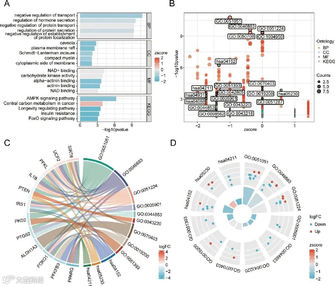 通过GO和KEGG富集分析及logFC联合分析,15个DMRDEGs在BP中富集于运输负调控、激素分泌调控等,CC中涉及洞穴、质膜筏等,MF中涵盖NAD+结合、碳水化合物激酶活性等,KEGG通路富集于AMPK信号、癌症中央碳代谢等。