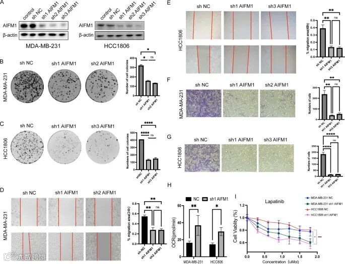 图15.实验验证AIFM1在乳腺癌细胞系中的作用。AMDA-MB-231和HCC1806细胞中AIFM1的敲除效率。B-C转染AIFM1shRNA后,通过集落形成实验检测MDA-MB-231和HCC1806细胞的增殖能力。D-E用于测量MDA-MB-231和HCC1806细胞迁移能力的划痕实验。F-G.对照组和shAIFM1组MDA-MB-231和HCC1806细胞经孔侵袭实验。H对照组和shAIFM1组诱导后,评估MDA-MB-231和HCC1806细胞系的OCR。I用浓度递增的拉帕替尼(0.3、0.6、0.9、1.2、1.5和1.8µM)处理癌细胞48小时后,通过CCK-8检测法确定细胞存活率。