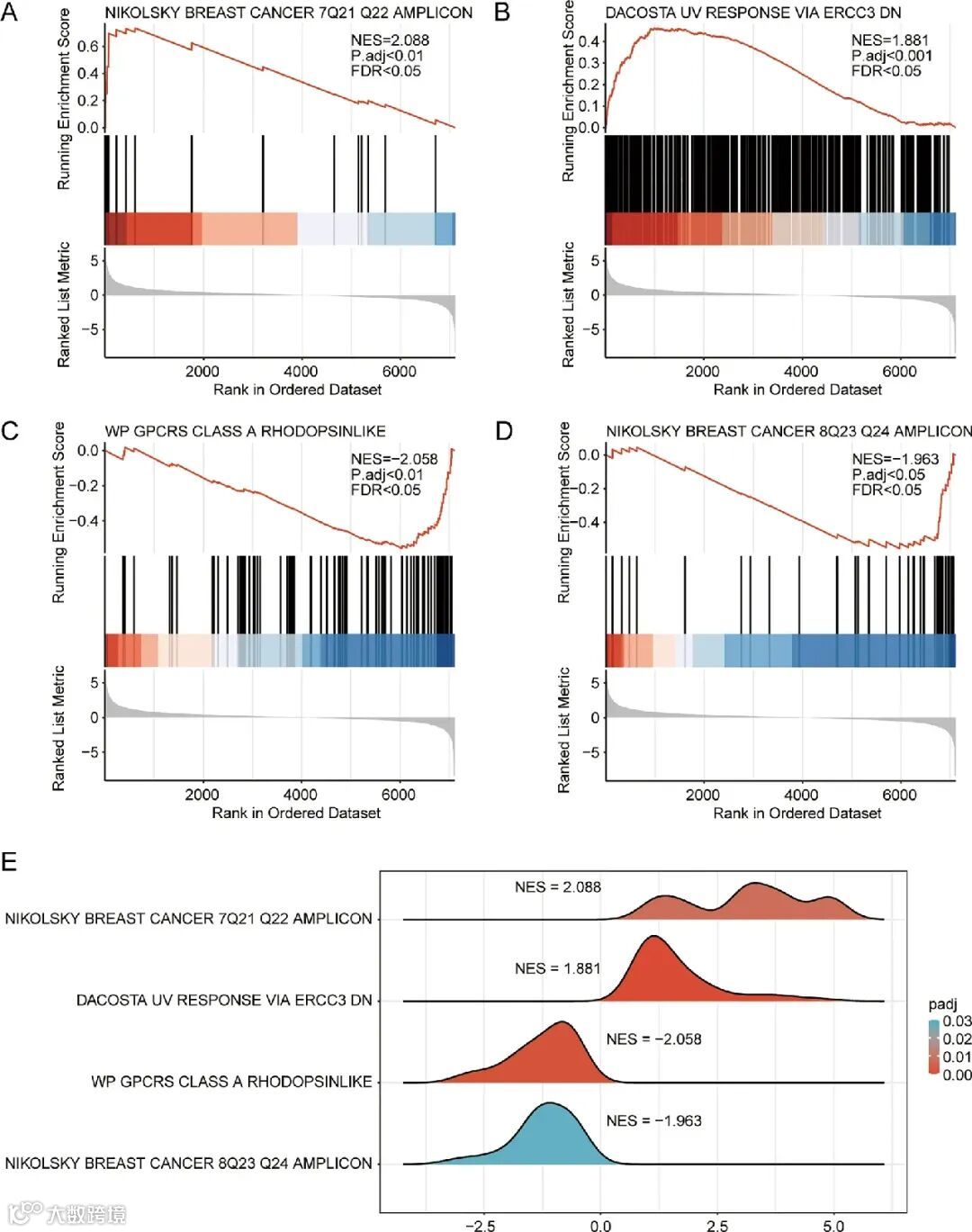 图5. TCGA-BRCA 数据集的 GSEA。A-D NIKOLSKY BREAST CANCER 7Q21 Q22 AMPLICON (A), DACOSTA UV RESPONSE VIA ERCC3 DN (B), WP GPCRS CLASS A RHODOPSINLIKE (C), NIKOLSKY BREAST CANCER 8Q23 Q24 AMPLICON(D)。E. 针对TCGA-BRCA 中不同疾病亚型的 4 个 GSEA 生物功能山图