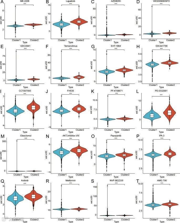 随后的分析突出了两种乳腺癌亚型之间不同的药物敏感性。此处列举了亚型之间表现出显著差异的前 20 种药物:MK.2206、拉帕替尼、AZD8055、WO2009093972、GDC0941、替西罗莫司、EHT.1864、GW.441756、CCT007093、FH535、PF.4708671、PD.0332991、Elesclomol、AKT。抑制剂.VIII、帕唑帕尼、IPA.3、阿昔替尼、二甲双胍、NVP。BEZ235 和 AMG.706。