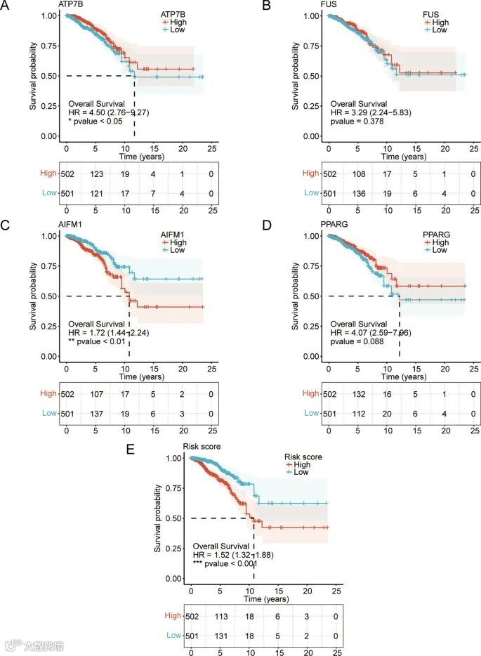 基于四个关键基因表达水平及风险评分对 TCGA-BRCA 分组并绘制生存预后 KM 曲线,结果显示低风险组预后更优;AIFM1 高表达组与低表达组生存预后差异极显著(p<0.01),低表达组预后更佳;ATP7B 高表达组与低表达组生存预后差异显著(p<0.05),高表达组预后更优。