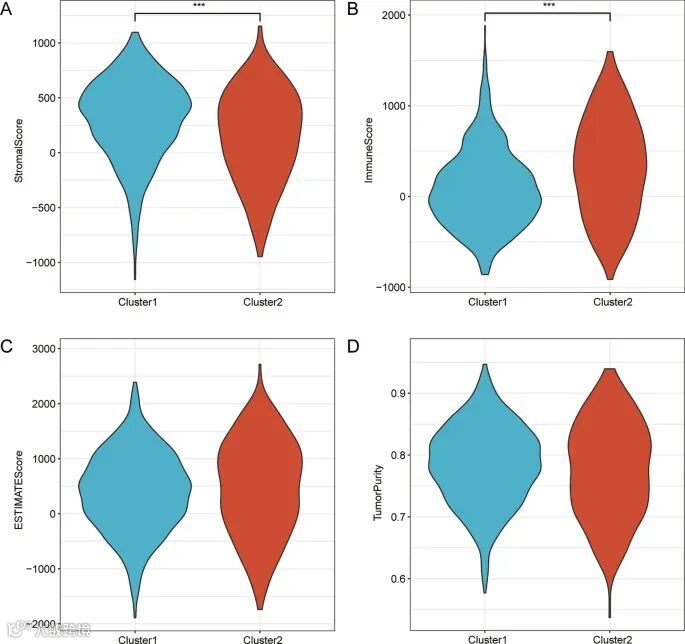 图8. 不同 BRCA 群之间的 ESTIMATE 分析。A-D 按基质评分(A)、免疫评分(B)、ESTIMATE 评分(C)和肿瘤纯度(D)比较不同疾病亚型的小提琴图。
