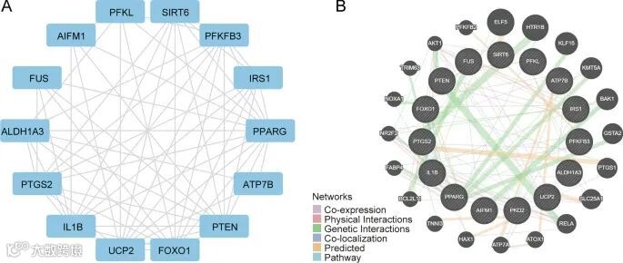 PPI 网络分析显示,15 个 DMRDEG 中有 14 个之间存在相互作用,具体为:ATP7B、SIRT6、FUS、UCP2、AIFM1、PFKL、IL1B、PTEN、IRS1、PTGS2、ALDH1A3、FOXO1、PFKFB3 和 PPARG。此外,GeneMANIA 数据库揭示了这些 DMRDEG 的相关基因,这些基因被鉴定为:ELF5、HTR1B、KLF15、KMT5A、BAK1、GSTA2、PTGS1、SLC25A1、RELA、ATOX1、ATP7A、HAX1、TNNI3、BC1L11、FABP4、NR2F2、NOXA1、TRIM63、AKT1 和 PFKFB2。