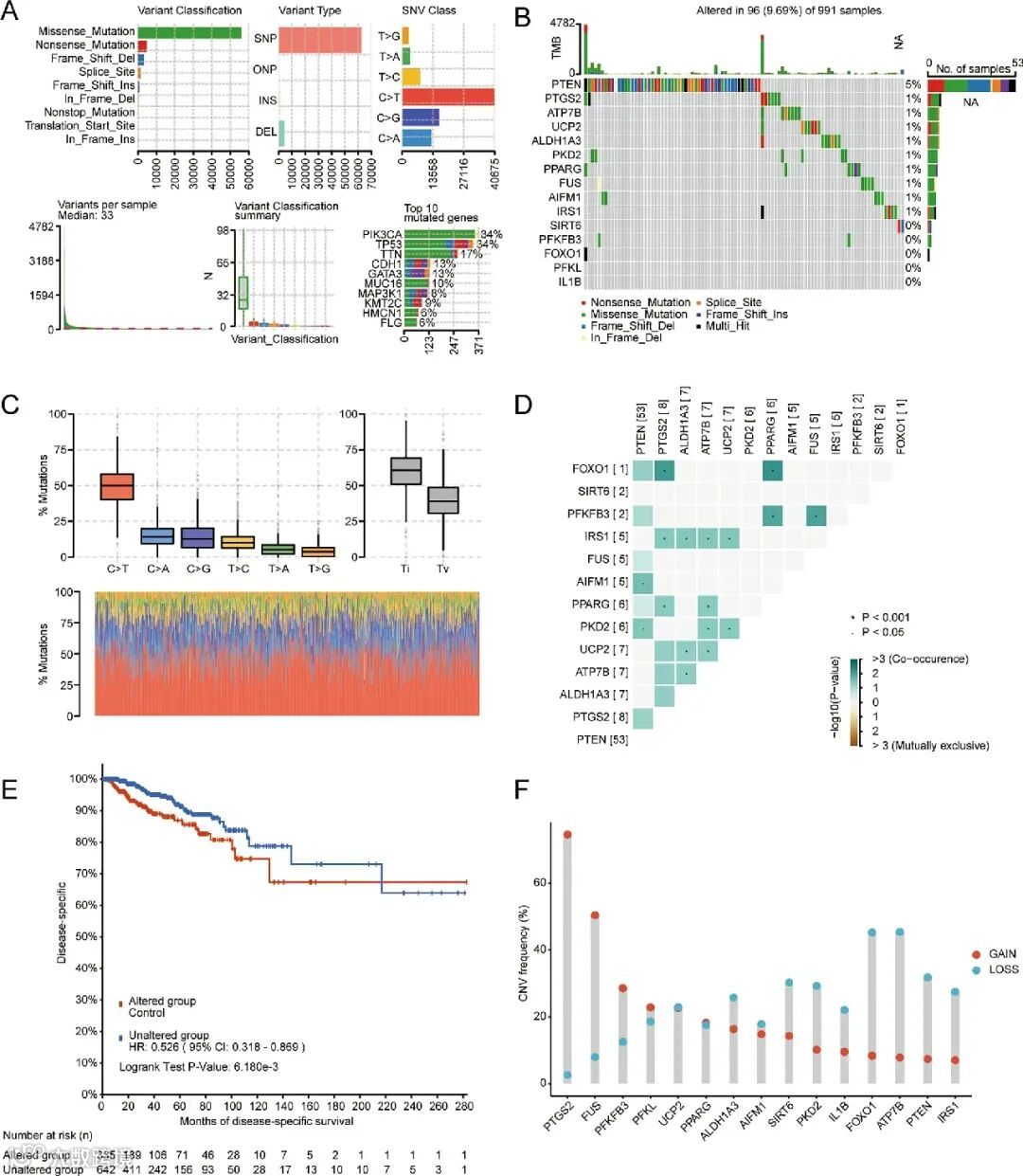 对TCGA-BRCA数据集中15个DMRDEGs(ATP7B、SIRT6等)的体细胞突变分析显示,主要突变类型为错义突变、无义突变和移码Del,SNV以C>T最常见,突变形式以SNP为主并伴随DEL和INS;15个基因均存在突变,占总突变样本的9.69%,其中PTEN突变率最高达5%;FOXO1与PPARG、PFKFB3与PPARG及FUS的突变存在显著关联(p<0.05);携带突变的样本与较差的DSS预后相关。