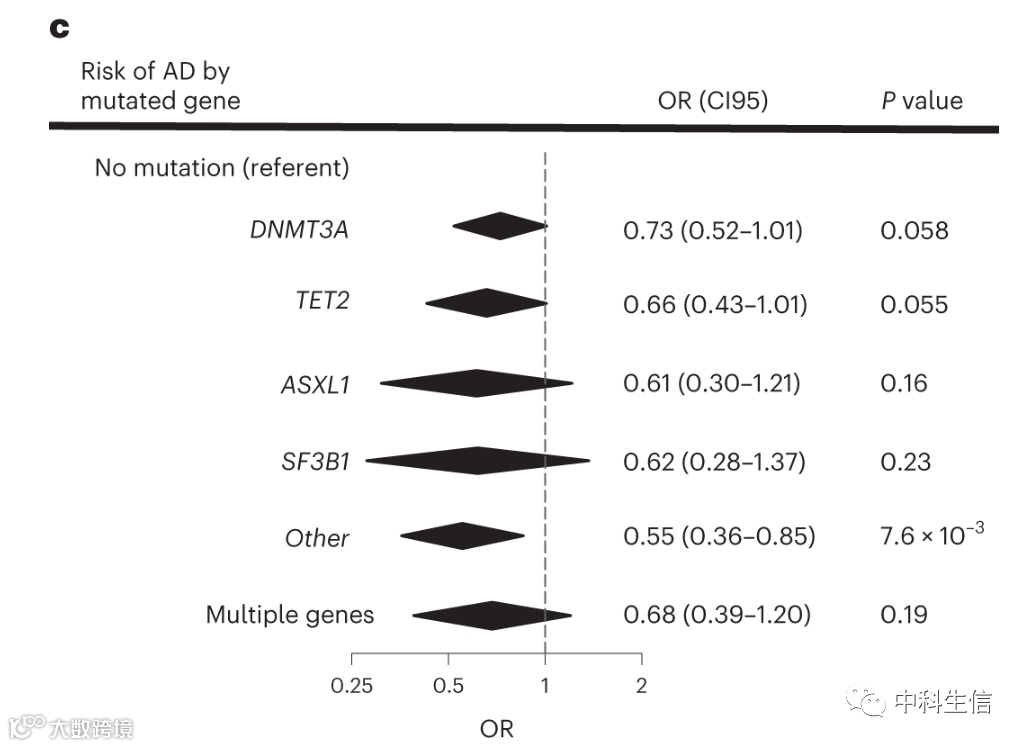 c,CHIP基因突变对CHS、FHS和ADSP参与者中AD的影响。