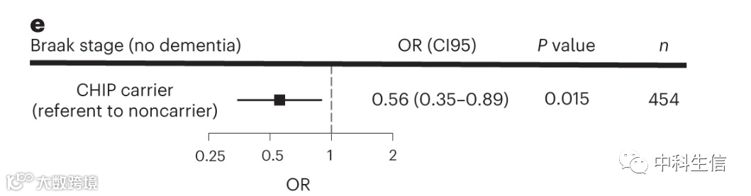 e,CHIP对没有痴呆症诊断的ADSP参与者中Braak阶段增加的风险的影响。OR和CI95是由顺序逻辑回归模型计算出来的,该模型包括尸检时的年龄、APOE基因型、性别和CHIP状态作为协变量。通过比较每个协变量的t统计量与标准正态分布,计算出双侧的P值。