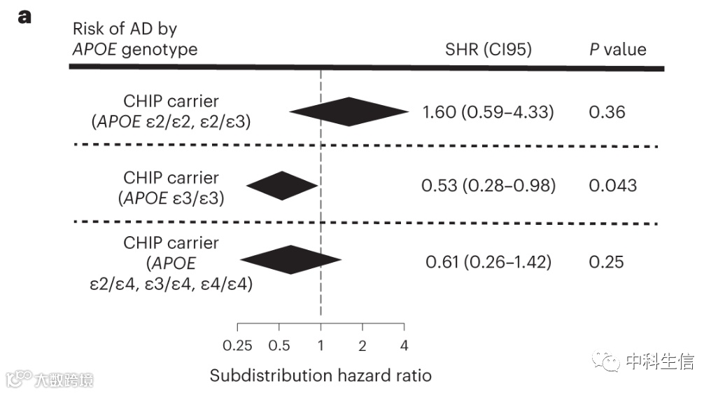 a, CHIP对按APOE基因型分层的CHS和FHS参与者的AD痴呆风险的影响。参与者被分为中性(APOE ε3ε3)、低风险(APOE ε2ε2和ε2ε3)和高风险(任何APOE ε4等位基因)组。
