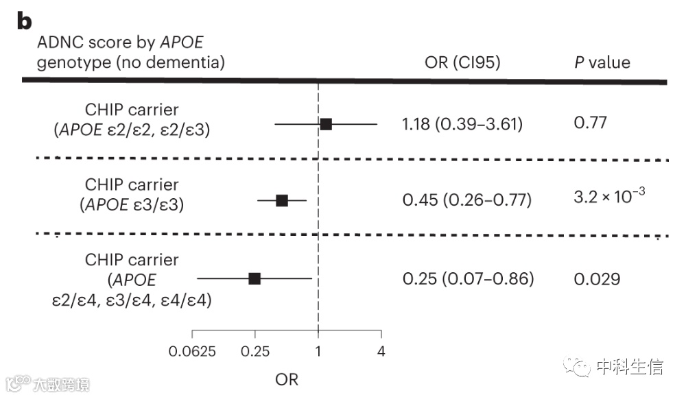 b,CHIP对ADSP中按APOE基因型分层的认知完整参与者的ADNC评分的影响。参与者被分为中性(APOE ε3ε3)、低风险(APOE ε2ε2和ε2ε3)和高风险(任何APOE ε4等位基因)组。