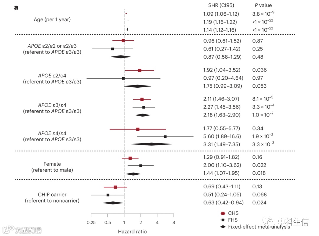 a, CHIP对Cardiovascular Health Study (CHS)和Framingham Heart Study (FHS)的AD发生风险的影响。subdistribution hazard ratio (SHR)、CI95和双侧Wald P值是根据 competing risks regression (CRR)模型计算出的每个协变量,其中包括抽血时的年龄、性别和APOE基因型等协变量。中心的衡量标准是SHR,线的长度代表SHR的CI95。然后用两个队列的固定效应模型对CHS和FHS的结果进行荟萃分析。