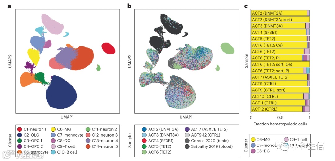 c, 本研究中每个样本中造血细胞的聚类组成。