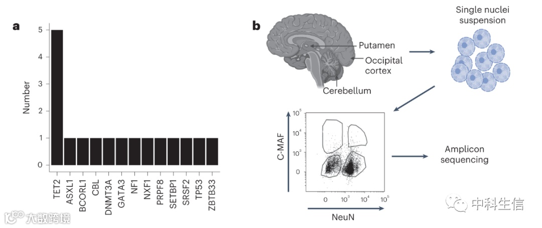a, 从1,775名ADSP患者的大脑DNA全外显子组测序中发现的推定的CHIP突变的柱状图。
