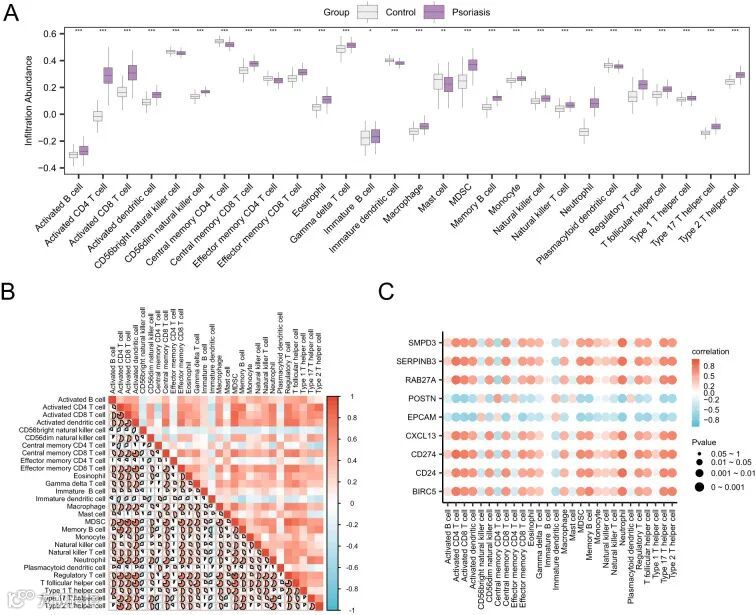 通过单样本基因集富集分析(ssGSEA),研究者评估了28种免疫细胞在银屑病和对照组中的浸润水平,发现所有免疫细胞的浸润水平在两组之间均存在显著差异(p < 0.05)(图8A)。相关性热图分析显示,大多数免疫细胞之间存在强正相关关系,其中调节性T细胞(Treg)和髓系来源的抑制细胞(MDSC)之间的相关性最为显著(r = 0.877,p < 0.05)(图8B)。此外,核心基因与免疫细胞浸润水平之间的相关性分析表明,CD274与活化CD4+ T细胞之间存在显著的正相关关系(r = 0.829,p < 0.05)(图8C),这进一步揭示了外泌体相关基因在银屑病免疫反应中的重要作用。
