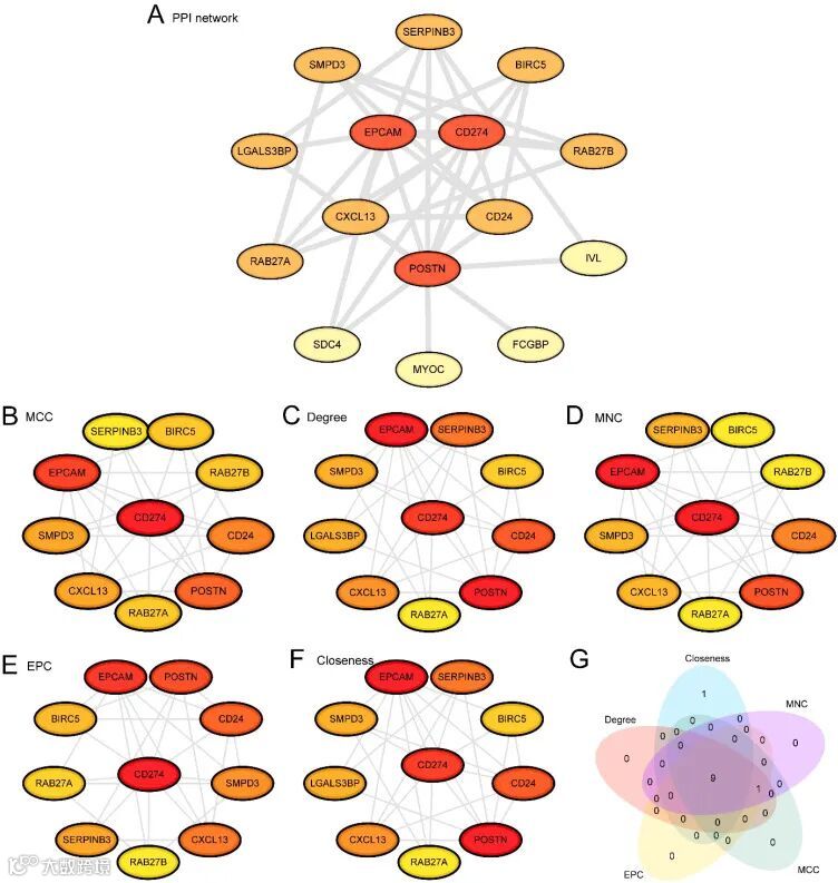 基于STRING数据库,研究者构建了16个ERDEGs的PPI网络(图5A),并利用CytoHubba插件中的五种算法(MCC(图5B)、Degree(图5C)、MNC(图5D)、EPC(图5E)和Closeness(图5F))对网络中的基因进行评分和排序,最终筛选出9个核心基因,包括POSTN、EPCAM、CD274、CD24、SERPINB3、CXCL13、SMPD3、BIRC5和RAB27A(图5G)。这些核心基因在PPI网络中具有较高的连接度和重要性,可能在银屑病的发病过程中扮演关键角色。