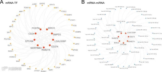 研究者进一步探索了这些核心基因的转录调控机制,通过ChIPBase数据库获取与核心基因相关的转录因子(TFs),构建了mRNA-TF调控网络,涉及9个核心基因和32个转录因子(图6A)。此外,还利用StarBase v3.0数据库分析了核心基因与miRNAs的相互作用,构建了mRNA-miRNA调控网络,包含7个核心基因和48个miRNAs(图6A)。这些调控网络的构建有助于深入理解外泌体相关基因在银屑病中的转录调控机制,为未来的治疗策略提供了潜在的干预靶点。