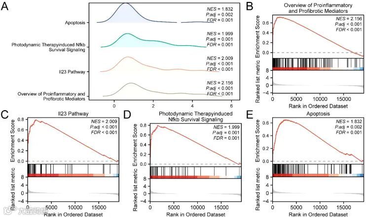GSEA分析进一步揭示了银屑病相关基因表达特征与多种生物学过程和信号通路的关联(图4A)。结果显示,整合后的数据集在促炎和促纤维化介质(图4B)、IL-23信号通路(图4C)、光动力疗法诱导的NF-kB生存信号(图4D)、凋亡(图4E)等通路中存在显著富集现象。这些结果不仅证实了外泌体相关基因在银屑病发病中的关键作用,还为深入理解银屑病的病理机制提供了丰富的信息。