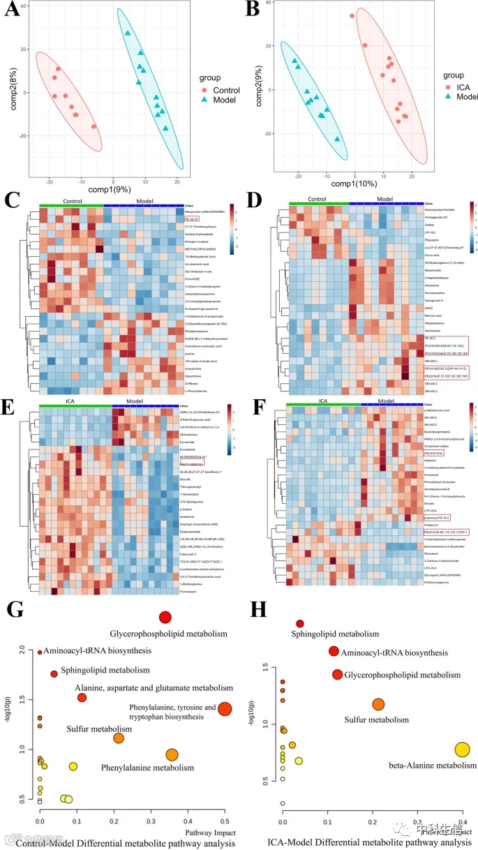 基于UPLC-MS/MS的非靶向血清代谢组学研究探索ICA对APP/PS1小鼠血清代谢物的影响。PLS-DA和OPLS-DA分析显示模型小鼠存在明显的代谢紊乱,经ICA处理后部分恢复(图4A-B)。VIP分析显示在对照组和模型组之间发现了总共99种差异代谢物(45种上调和54种下调),在ICA组和模型组之间发现了111种差异代谢物(40种上调和61种下调)。ICA给药对血清代谢物的相对丰度有显著影响,特别是甘油磷脂(图4C-F)。代谢途径分析表明ICA可能与甘油磷脂代谢和鞘脂代谢的调节有关(图4G-H)。总之,这些发现表明ICA调节肠道代谢和随后代谢物的合成,特别是鞘脂和甘油磷脂,它们通过循环影响宿主。