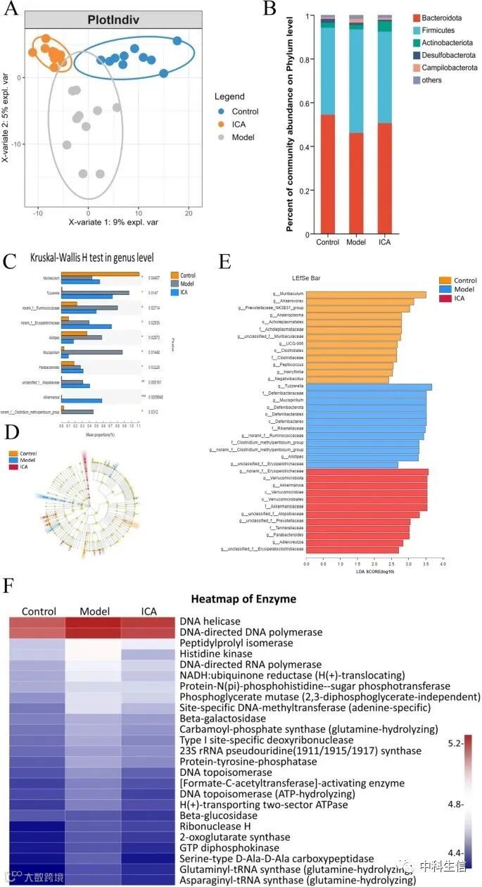 ICA是一种活性成分,提取自淫羊藿属植物,其通过抑制磷酸二酯酶-5活性和减少外部Aβ斑块和细胞内NFTs来介导抗AD作用,因此,ICA可能是一种有前途的治疗AD的化合物。在本文中,作者通过整合16s rRNA测序、多代谢组学和网络药理学分析来探索ICA抗AD功能相关的潜在机制的研究。结果表明,ICA能有效改善AD引起的认知障碍和病理改变。此外,ICA改善了AD诱导的APP/PS1小鼠肠道菌群失调和代谢紊乱。并且发现肠道微生物群和鞘脂代谢相关,这可能是ICA治疗AD的关键因素,ICA治疗可能通过微生物组-代谢物-脑轴预防AD的发展