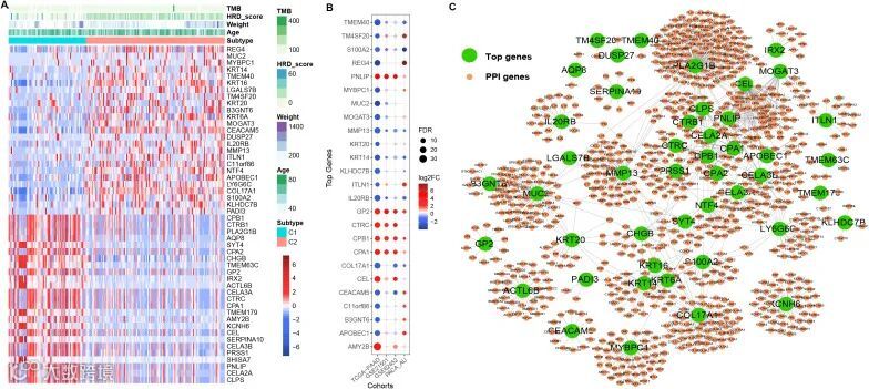 对TCGA-PAAD的PCA亚型进行了差异表达分析,识别出2165个差异表达基因(DEGs)(补充表S2)。可视化了两个PCA亚型中前50个基因的表达水平,显示出它们之间存在显著差异(图2A)。此外,这些基因在独立验证数据集(PACA-AU,GSE62452,GSE21501)中表现出一致的差异表达模式(图2B)。基于STRING蛋白质相互作用网络,我们构建了前50个差异表达基因的PPI网络(图2C)。