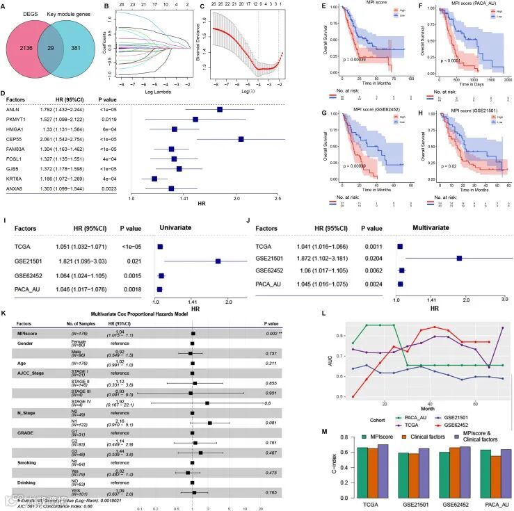 首先将Black模块基因与PCA亚型差异表达基因取交集(图4A),随后通过单变量Cox回归(P≤0.5,附表S4)和LASSO回归筛选预后特征基因。当特征基因数量为9时模型效能最优,最终确定ANLN、PKMYT1、HMGA1、CEP55、FAM83A、FOSL1、GJB5、KRT6A和ANXA8为核心预后标志物(图4B-C)。Cox回归分析证实,所有九个预后因素都与增加的风险相关(HR≥1,p≤0.05;图4C)。为了评估这些预后因素对患者生存的综合影响,根据它们的表达水平和Cox回归系数构建了一个预后评分模型。然后计算每个样本的MPI评分(图4D)。为了评估MPI评分模型的预后效果,根据中位MPI评分将样本分为两组,发现两组在总生存期(OS)上存在显著差异(图4E)。此外,还分析了独立验证数据集(PACA-AU、GSE62452和GSE21501),以确认MPI评分模型的预后准确性。KM生存曲线显示,高MPI评分与低MPI评分患者在生存时间上有显著差异(图4F-H)。这些结果与TCGA-PAAD数据集的结果一致。此外,MPI评分模型的预后效能在TCGA数据集和独立验证数据集PACA-AU、GSE62452以及GSE21501中进行了评估。单因素Cox回归分析确定了MPI评分是患者生存的重要风险因素(图4I)。在调整年龄、性别和肿瘤分级等临床因素后,多因素Cox回归分析证实了MPI评分在这些数据集中仍然是独立的预后因素(图4J)。特别是在TCGA-PAAD数据集中,多因素Cox回归分析表明MPI评分是一个独立的预后因素(HR=1.04 [95% CI, 1.01–1.1];p=0.002;图4K)。此外,在不同时间点进行的ROC曲线分析表明该模型具有强大的预后性能(图4L)。还评估了单独的MPI评分、单独的临床因素以及它们组合的C指数。值得注意的是,结合MPI评分和临床因素的模型在各个数据集中表现出最高的C指数(图4M)。