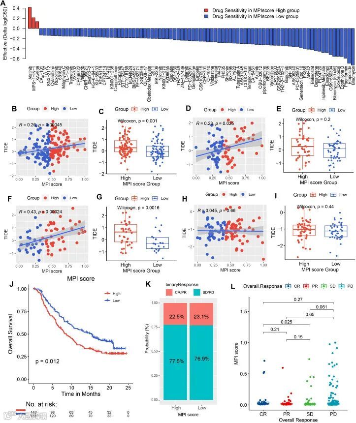 此外,从GDSC下载了药物基因组学数据。我们发现,对于某些抗癌药物,高MPI评分的患者对药物反应更为敏感,例如阿法替尼(图7A)。相反,对于依托泊苷、多柔比星和吉西他滨,低MPI评分的患者对药物反应更为敏感(图7A)。还分析了MPI评分与TIDE评分之间的相关性,结果显示在三个验证数据集中存在正相关关系(图7B、D、F)。例如,GSE62452显示出最强的正相关性(R²=0.43,p=2.4E−04,图7F)。此外,高MPI评分组患者的TIDE评分在所有三个数据集中均显著较高(图7C、E、G)。然而,在GSE21501中,相关性未达到统计学显著性(图7H、I)。为了探讨MPI评分是否可以作为免疫治疗反应的标志,使用R包IMvigor210CoreBiologies从接受PD-L1抑制剂阿特珠单抗治疗的患者中提取了一组转录组和临床数据进行验证分析。高MPI评分与更好的治疗后结果相关(p=0.012,图7J)。此外,高MPI评分组和低MPI评分组对阿特珠单抗的反应比例(CR/PR)相似(高MPI评分组:22.5%;低MPI评分组:23.1%;图7K,L)。
