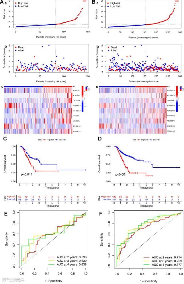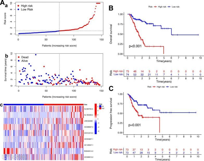更确切地说,9个lncRNA特征的计算公式如下:风险评分=AL590705.3×0.66886188 + AL160408.4×1.149815373 + LINC02408×1.168787096 + AC008937.3×(-1.514330673) + AC012213.3×0.64219404 + AC055807.1×0.994224804 + AC129507.1×0.825667702 + BX640514.2×(-0.799392558) + AC008915.2×0.488035795。计算训练队列中GC患者的风险评分,并以中位风险值为界将患者分为高风险组和低风险组(图 2A)。Kaplan-Meier生存曲线显示,高风险组患者的总生存期(OS)和无进展生存期(PFS)均短于低风险组(图 2B、C)。