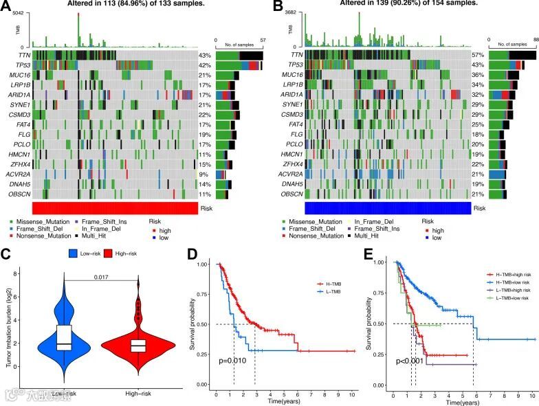 近年来,免疫治疗逐渐成为改善GC患者预后的有前景方法,其中肿瘤突变负荷(TMB)可能是抗肿瘤免疫治疗反应中不可忽视的预后因素。高低风险组患者的基因突变谱如瀑布图所示(图 6A,B)。根据瀑布图,高风险组中突变频率最高的前五个基因是TTN(43%)、TP53(42%)、CSMD3(22%)、MUC16(21%)和 SYNE1(21%),而低风险组中突变频率最高的前五个基因是TTN(57%)、TP53(43%)、MUC16(36%)、LRP1B(34%)和ARID1A(32%)。此外,我们还发现低风险组的基因突变频率高于高风险组,这与低风险组TMB更高的结果一致(图 6C)。生存分析表明,高TMB患者的生存期长于低TMB患者(图 6D)。然而,随着患者风险评分的增加,高TMB状态相关的生存优势被削弱,这表明TMB状态与风险特征的结合可以更准确、科学地预测患者预后,并指导临床诊断和治疗(图 6E)。