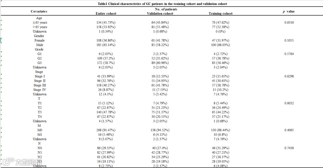 从TCGA数据库的GC队列中共提取了16,876个lncRNA。此外,通过差异表达分析,在1136个线粒体相关基因中筛选出704个差异表达基因(DEMG)。结合上述信息,我们鉴定出1571个线粒体相关lncRNA,如桑基图所示(图 1A)。此外,还鉴定出360个与线粒体相关lncRNA显著相关的DEMG(图 1A)。通过将符合筛选标准的293例GC患者按1:1的比例随机分配到训练集和测试集,构建了最终的风险模型。卡方检验显示,两组的临床病理特征无显著差异(表 1)。通过单变量Cox回归分析,我们进一步鉴定出108个预后相关的线粒体lncRNA(表 2)。随后采用LASSO回归筛选出不合适的线粒体相关lncRNA,避免模型过拟合(图 1B,C)。此外,通过多变量Cox回归分析,构建了包含9个线粒体相关lncRNA的预后特征(图 1D)。