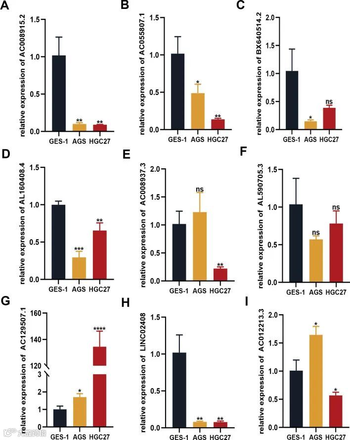 我们通过RT-PCR检测AC008915.2、AC055807.1、BX640514.2、AL160408.4、AC008937.3、AL590705.3、AC129507.1、LINC02408和AC012213.3在GC细胞系(AGS和HGC27)中的表达,以筛选用于后续研究的靶基因(图8)。结果显示,各研究的靶基因(图8)。结果显示,各基因在不同GC细胞系中的表达存在差异,其中AC129507.1在AGS和HGC27细胞中稳定高表达,因此被选为后续实验的靶标(图8G)。