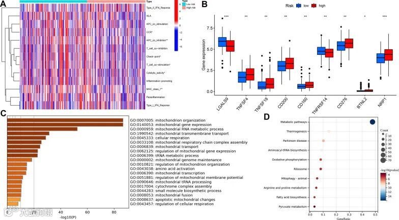 采用单样本基因集富集分析(ssGSEA)以更直观地阐明风险特征与GC患者免疫微环境的相互作用。我们发现高、低风险组在趋化因子受体(CCR)表达、抗原呈递细胞(APC)共诱导、免疫检查点、T细胞共刺激、细胞溶解活性和MHC I类分子表达等免疫功能上存在显著差异,表明低风险组的免疫功能更为活跃,这与既往结论一致(图7A)。受这些结果启发,我们进一步分析了两组间免疫检查点的差异:低风险组中LGALS9和TNFRSF14呈上调表达,而高风险组中TNFSF4、TNFSF18、CD200、CD160、CD276、BTNL2和NRP1常呈上调表达,这反映了免疫微环境的复杂性和多变性(图7B)。为探究高低风险组生存差异的潜在机制,我们对差异表达基因进行GO和KEGG分析。有趣的是,GO分析显示除线粒体相关功能外,氨基酸激活、细胞呼吸和呼吸链复合物组装等代谢功能也显著富集(图7C)。KEGG分析还鉴定出氧化磷酸化、脂肪酸生物合成、精氨酸与脯氨酸代谢及丙酮酸代谢等多条代谢信号通路,提示可从代谢角度阐释生存差异的内在机制(图7D)。