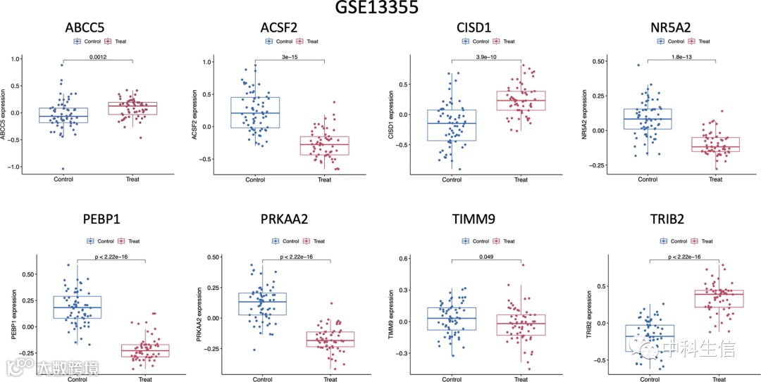 最后,基于GSE13355数据集验证了标记基因表达水平。结果显示,NR5A2、CISD1、PRKAA2、TRIB2、ABCC5、ACSF2、TIMM9和PEBP1的表达谱与GSE117239数据集的表达谱相似。