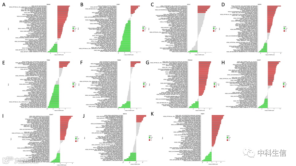 探索标记基因在区分健康样本与银屑病中的可能作用,进行了单基因GSEA-KEGG通路分析。图S1显示了与标记基因相关的6种途径。随后,根据GSVA和标记基因表达水平分析了银屑病与正常组相比具有差异激活水平的途径(图S2)。