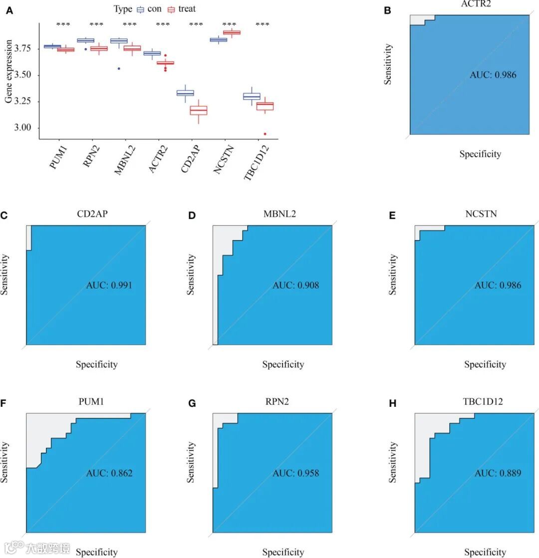 6个特征基因(ACTR2、CD2AP、MBNL2、PUM1、RPN2和TBC1D12)在RM样本中的表达水平显著降低,而NCSTN的表达水平显著高于RM样本。GSE179996使用AUC值预测RM 7个签名基因的诊断性能。