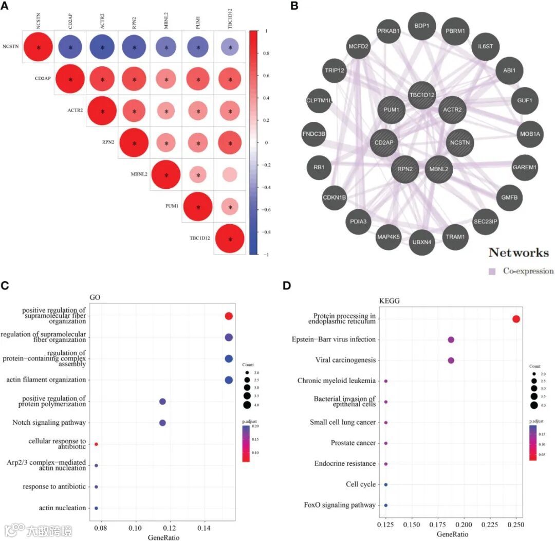 从LASSO、随机森林和SVM-RFE算法中鉴定出7个共享的特征基因:ACTR2、CD2AP、MBNL2、NCSTN、PUM1、RPN2和TBC1D12。
