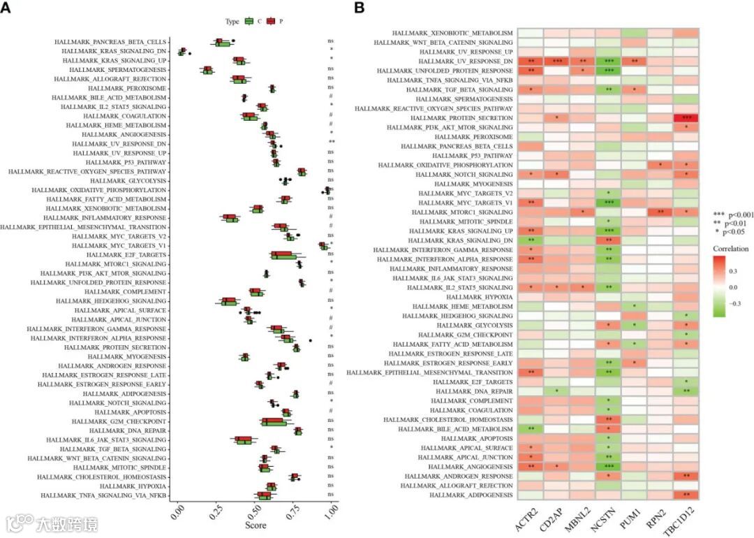 为了评估签名基因之间的关系,作者构建了共表达网络和蛋白质相互作用网络。利用GSE165004数据集分析了签名基因之间的共表达关系。NCSTN的表达水平与其他6个特征基因的表达水平呈负相关。其他6个特征基因彼此之间呈正相关。为了分析7个签名基因的蛋白相互作用网络,使用GeneMANIA数据库创建了一个PPI网络。