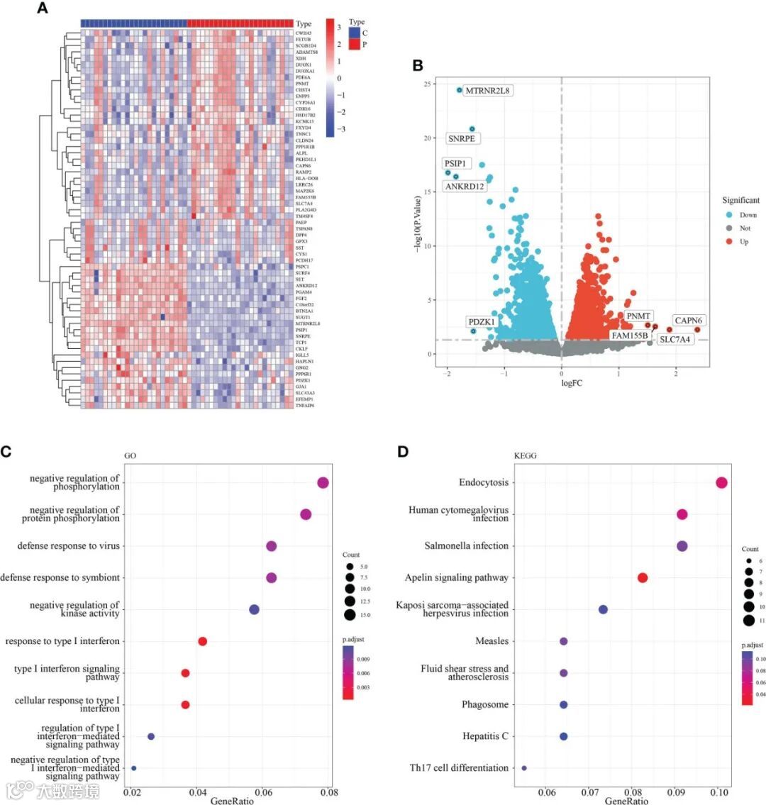 GSE179996队列中的24例正常流产标本和24例复发性流产标本的表达谱进行分析。通过对1384个巨噬细胞相关标记基因的单细胞测序筛选,共获得1293个巨噬细胞相关标记基因,这些基因与GSE179996表达谱中的基因相交。GSE179996数据集的差异表达分析显示,疾病组中有90个巨噬细胞标记基因显著下调,96个巨噬细胞标记基因显著上调。对这些差异表达的巨主要参与的信号通路为内吞作用、人巨细胞病毒感染、Apelin信号通路和Th17细胞分化。