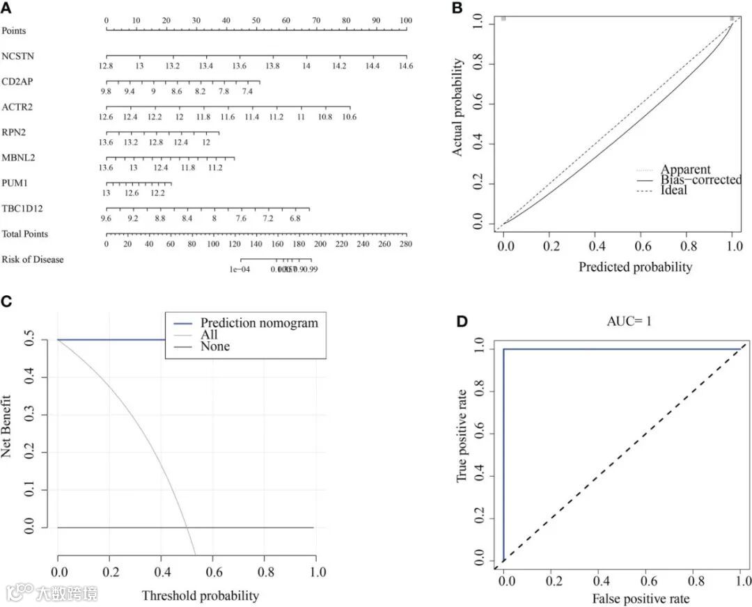 校准曲线表明真实RM风险与预测RM风险之间的差异最小,说明RM模型非常准确。决策曲线分析(DCA)表明,患者可以从这些列线图中获益。通过ROC曲线分析,也验证了模型的正确性。