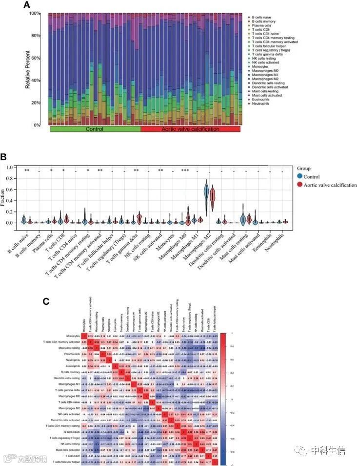 由于我们观察到MS相关基因可以调节AVC的发病机制,并且主要在免疫调节中富集,因此进行免疫细胞浸润分析以更好地阐明AVC的免疫调节。结果表明AVC患者的各种免疫细胞都有不同程度的浸润,这可能是AVC治疗的潜在调节点。