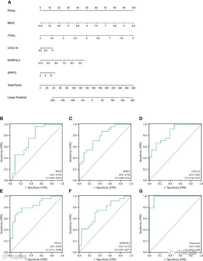 基于五个候选hub基因构建诺模图,并绘制ROC曲线以评估每个基因和诺模图的诊断特异性和敏感性。所有候选基因对AVC伴MS具有较高的诊断价值,构建的诺模图具有最高的诊断价值。