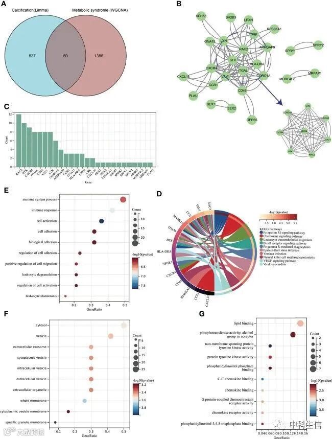 为了进一步探讨MS相关的关键基因是否与AVC发病机制相关,从AVC的587个DEG和MS的1436个模块基因中鉴定了50个共有基因。KEGG富集和GO分析表明,这些基因与免疫密切相关。接着构建了PPI网络,26个基因可以相互作用,通过MCODE插件可视化最活跃的模块。