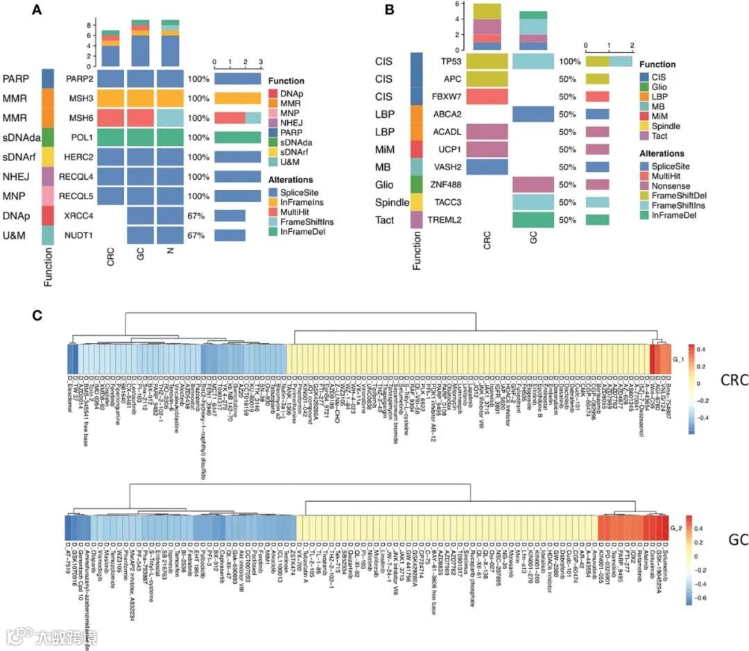 研究结果揭示了CRC和GC的共同和不同的突变模式。DNA修复和p53通路的共同突变可能是肿瘤同步发生的遗传背景。此外,不同的突变模式可能解释了GC和CRC特定的细胞亚群分布。特殊的突变模式也导致了不同的药物反应(图5)。