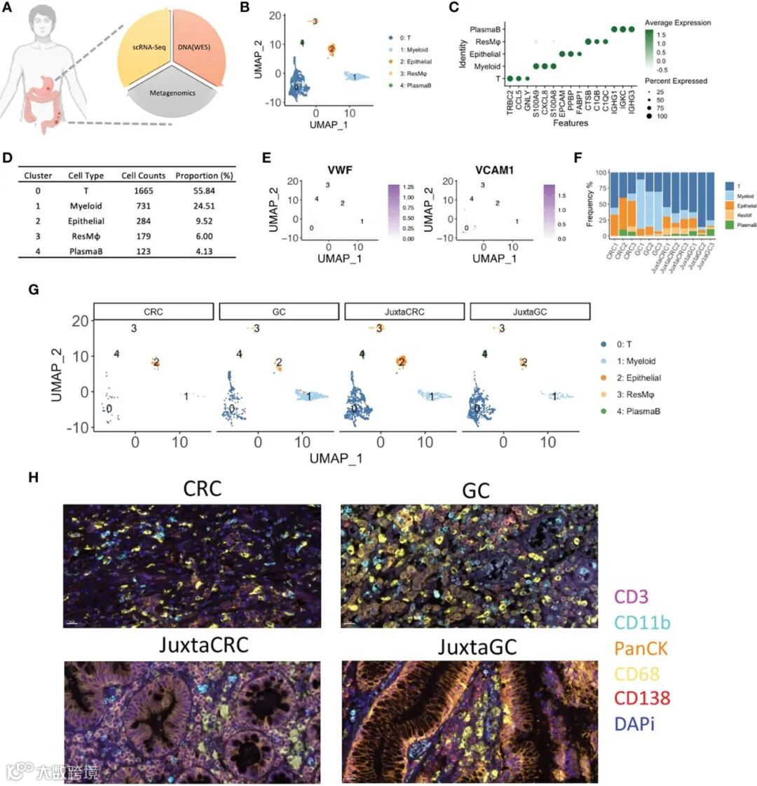 通过单细胞RNA测序、全外显子组测序(WES)和微生物组测序对恶性肿瘤(CRC和GC)和正常(Juxta CRC和Juxta GC)样品进行分析,以覆盖TME的细胞突变和微生物组成分,并全面了解双恶性肿瘤免疫特征。大多数细胞被定义为T细胞,其特征是T细胞受体β常数2的表达。每个总体在样本中的分布如下图所示。我们发现正常样本的成分相似,T细胞占主导地位,粒细胞、上皮细胞、巨噬细胞和浆B细胞的比例相当。与相应的相邻正常样品相比,GC样品中的巨噬细胞和骨髓细胞显着增加,显示出CRC和GC之间TME的多样性(图1)。
