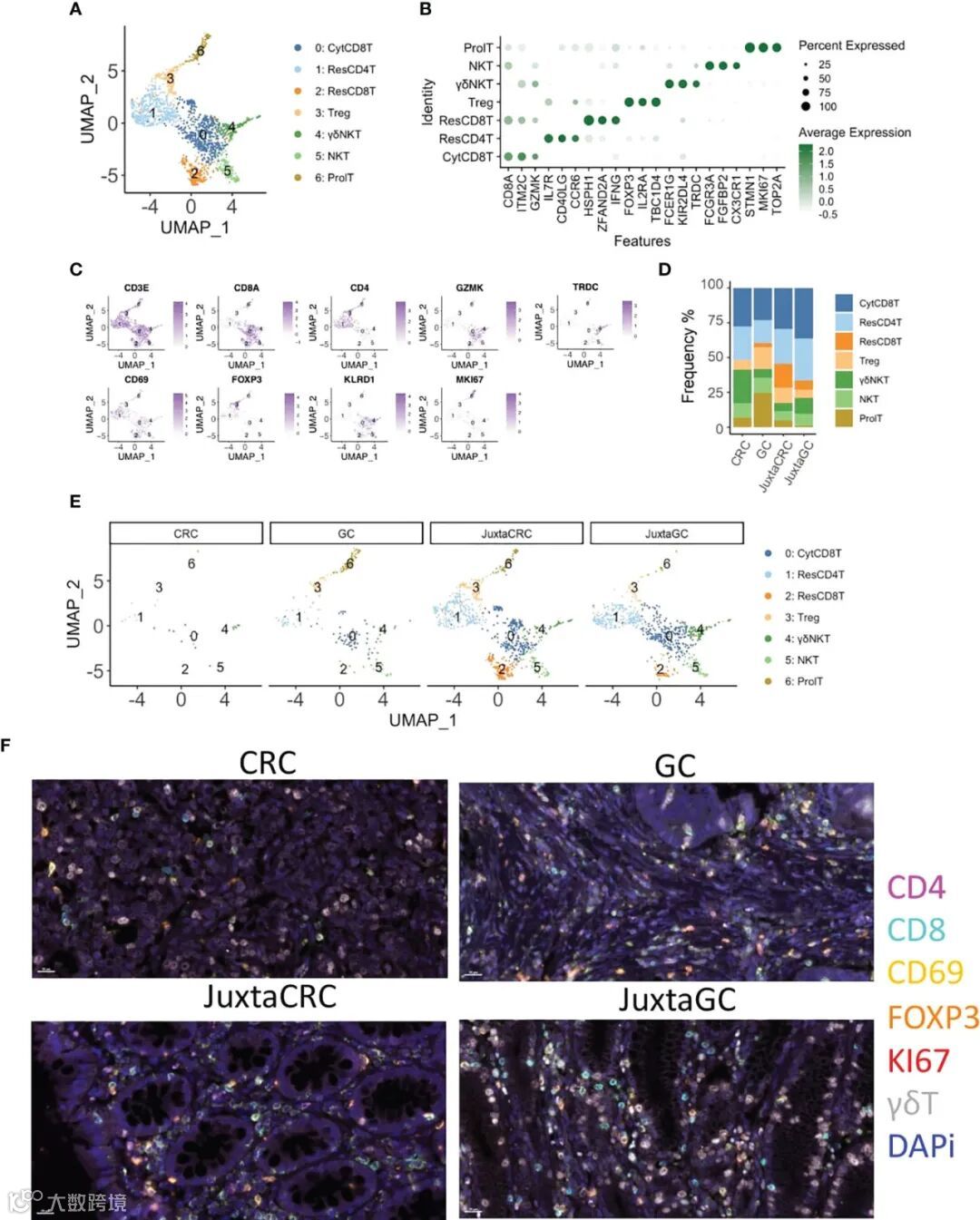 T细胞群的UMAP图揭示了7个细胞亚群,即细胞毒性CD8 T细胞(Cyt CD8T)、CD4 T细胞(Res CD4T)、常驻CD8+T淋巴细胞(Res CD8T)、调节性T细胞(Treg)、γ-δ-NK T细胞(γδNKT)、NK T细胞(NKT)和增殖T细胞(Prol T)。在癌旁正常部位T细胞亚群占优势,并且在GC和CRC的相邻区域T细胞亚群的分布模式也相似。然而,T细胞亚群在GC和CRC肿瘤部位的分布不同。CRC中T细胞亚群减少,而GC部位富集Treg和增殖T细胞(图2)。