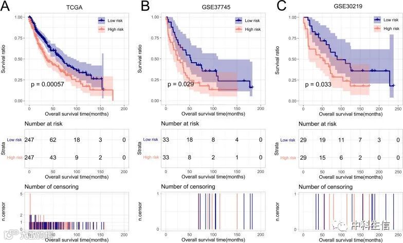 K-M曲线分析(图5)。TCGA 集 ( a )、GSE37745数据集 ( b ) 和GSE30219数据集 ( c )中高风险和低风险肿瘤样本的 Kaplan-Meier 生存曲线。