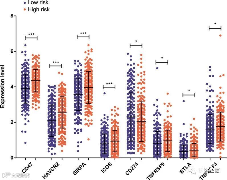 8个差异表达的免疫检查点基因在高危和低危患者中的表达水平(图9)。