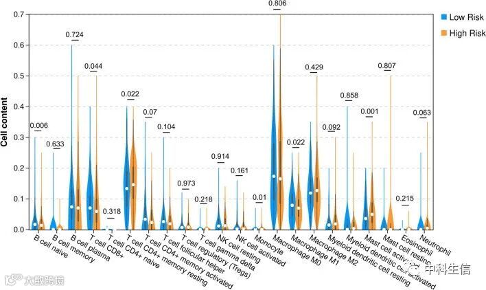 2、在不同的风险组中进行肿瘤浸润免疫细胞分析。
