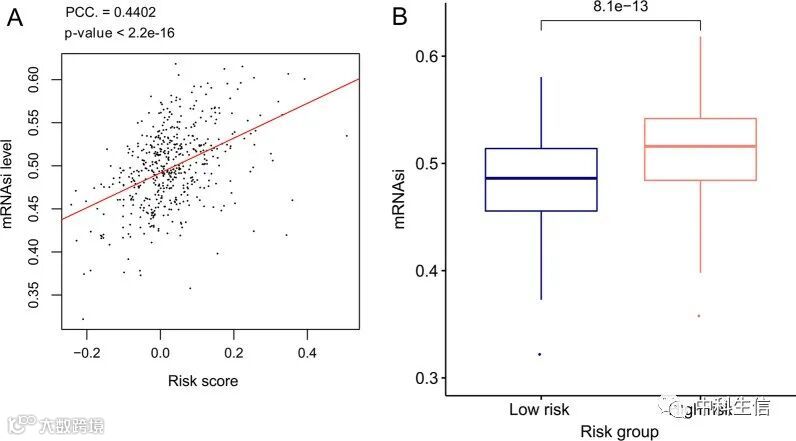 风险评分与干性指数的关联(图6)。a mRNAsi 值与风险评分的相关性;b TCGA 集中高风险和低风险样本之间 mRNAsi 值的比较。