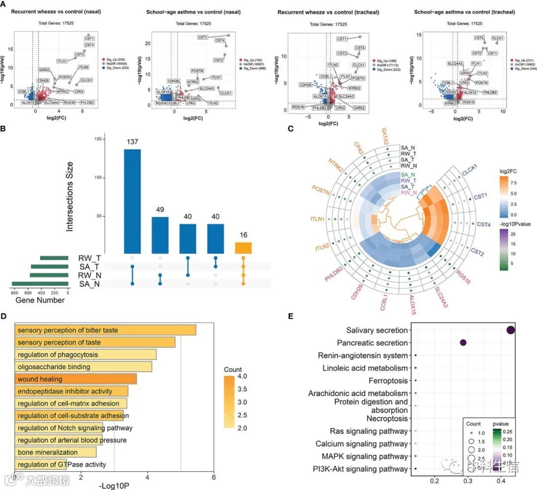大家晚上好!今天小编和大家分享一篇1月27日发表在Frontiers in Immunology(IF:8.7)杂志上的题目为《Network analyses of upper and lower airway transcriptomes identify shared mechanisms among children with recurrent wheezing and school-age asthma》的文章。作者基于鼻腔和气管普通转录组数据和单细胞转录组数据,通过上呼吸道和下呼吸道转录组的网络分析,揭示了反复喘息 (RW)和学龄期哮喘 (SA) 中的共同转录组学机制和中枢基因。
