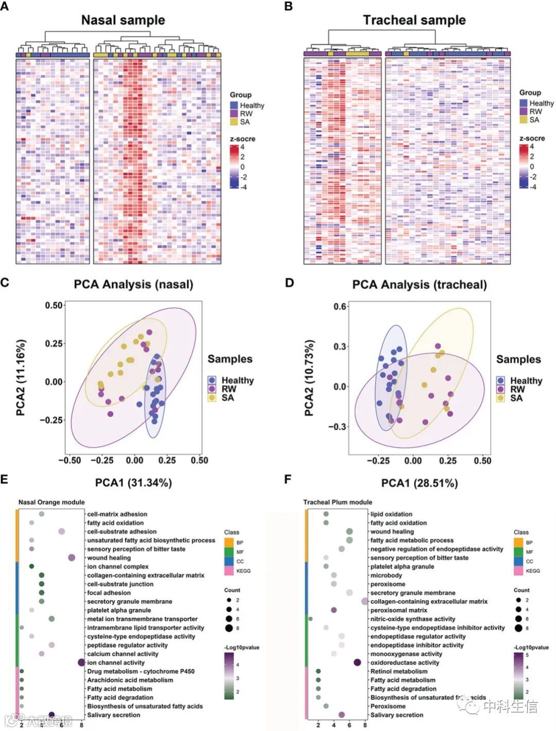 我们通过识别两个关键共识模块的生物途径和 GO 术语,进一步探索了 RW 和 SA 之间的共享机制。总的来说,鼻腔和气管共识模块与几个类似的 GO 术语相关,包括脂肪酸氧化、脂肪酸代谢过程和苦味的感官感知(图4E、F)。脂肪酸代谢相关通路在鼻orange和气管plum模块中也显着富集(图 4E、F)。