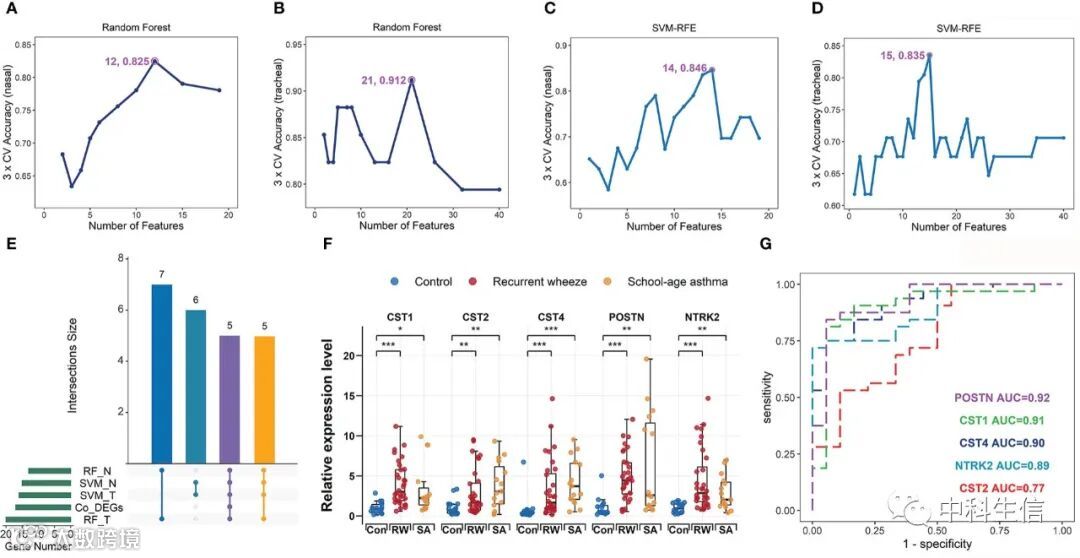 为了在关键共识模块中进一步筛选与 RW 和 SA 最相关的中心基因,基于RF和SVM-RFE,分别识别出鼻orange模块中的12个和14个特征基因具有最佳分类精度(图5A,C),而气管plum模块中的21个和15个特征基因被识别为最佳分类准确度分别基于 RF 和 SVM-RFE(图 5B、D)。如图5E中的UpSet图所示,五个基因(CST1、CST2、CST4、POSTN 和 NTRK2)在两种算法之间重叠。这五个基因也是 RW 和 SA 之间的共 DEG(图 5C),因此被选为中枢基因。接下来,我们使用来自 18 个对照、15 个 SA 儿童和 32 个 RW 学龄前儿童的 BAL 样本的 qRT-PCR 检查了中枢基因的 mRNA 表达水平。在比较 hub 基因的表达水平后获得了类似的结果,揭示了 CST1、CST2、CST4、POSTN 和 NTRK2 在患有 RW 的学龄前儿童和患有 SA 的患者中的比例过高(图 5F )。此外,CST1、CST2、CST4 和 NTRK2 显示出中到高的辨别力(分别为 AUC = 0.91、0.77、0.90 和 0.89),POSTN 显示出高辨别力(AUC = 0.92)以区分 RW 和对照(图5G)。
