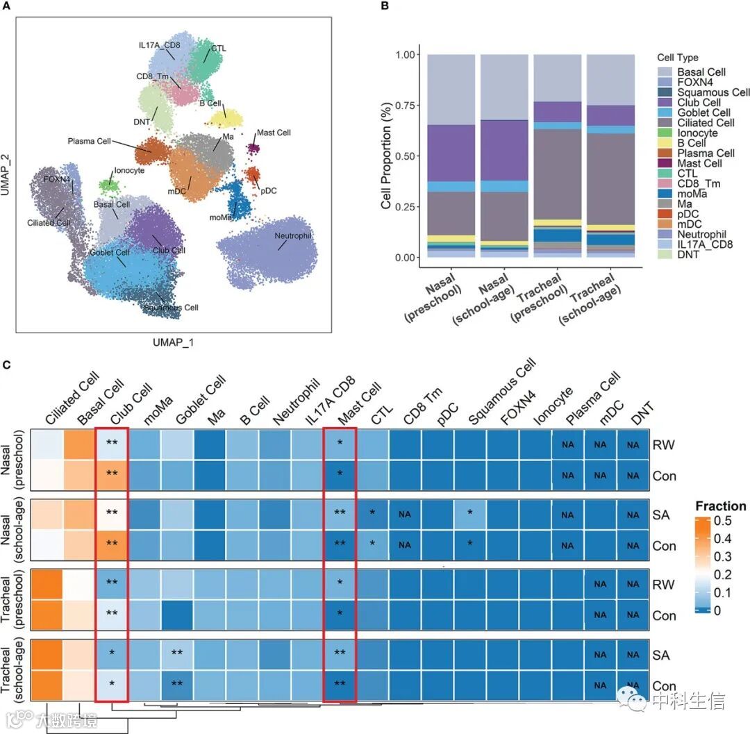 为了了解 RW 和 SA 气道微环境的变化以及 RW 和 SA 共享的潜在关键细胞群,我们对上部和下部大量转录组数据进行了细胞反卷积,以推断 RW 和 SA 气道内细胞类型频率的变化。首先,我们使用来自 18 名健康儿童气道样本的细胞分析了 scRNA-seq 数据。经过严格的质量控制,保留了 38 399 个细胞用于进一步分析。UMAP 的无监督聚类根据先前研究 中的代表性标记基因确定了 18 个细胞亚群 (图 2A ) 。接下来,使用来自 scRNA-seq 分析的特征矩阵,我们使用 CIBERSORTx 计算了 RW、SA 和对照样本的 18 个细胞亚群的相对比例。图 2B中的直方图显示了学龄前和学龄儿童上呼吸道和下呼吸道中每种细胞类型的比例。然后我们检查了 RW 和 SA 与对照组之间每种细胞类型的分数差异。有趣的是,与健康对照组相比,在 RW 和 SA 患者的上呼吸道和下呼吸道均观察到更高比例的肥大细胞和更低比例的棒状细胞(图 2C )。